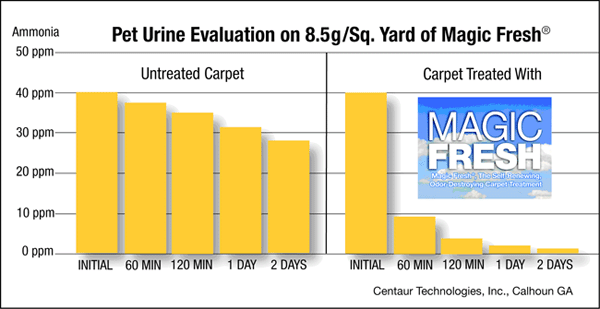 Men and women were asked to judge the strength of the odor in a blind smell test. After two days, participants detected very little or no odor at all with the Magic Fresh samples, while the untreated samples still had a strong pungent odor. The test also registered the presence of ammonia in parts per millionth (the odor-causing component of urine) in the air over the same two-day period. The Magic Fresh samples registered a sharp and rapid decline in the ammonia level in the air of the test chamber over the same 48-hour period.