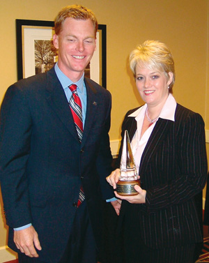 | | | Best Overall Runner-Up: Shaw Industries also regained its position at the winner’s podium as it was chosen the Runner-Up for Best Overall Manufacturer The company had occupied this spot two years ago. Receiving the custom-made crystal trophy are, Scott Sandlin, vice president of marketing, and Kim Barta, brand manager for Shaw Living, the mill’s rug division. |
