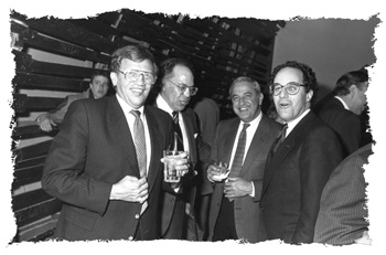 This photo was taken in 1986 during an Allied Fibers Division party at the Chicago market. The festivities were held to celebrate Allied’s new Anso V Worry-Free carpet. The two prominent retailers in the picture were worry-free because they had nothing to worry about, the drinks were free. Shown, from left, are Herb Wolk of Cadillac Carpet, Westbury, N.Y.; Phil Steinway of Galaxy Carpet; Sam Prizant of Prizant Carpets, Pittsburgh, and Fred Poses, president of Allied Fibers. Held at the Limelight Disco, the party featured a monologue by the star of Allied’s national advertising campaign, comedian Don Rickles.