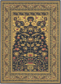 In Karastan’s English Manor collection, black is also a focal point. Regent’s Park is an antique prayer rug pattern rendered in a black and khaki combination. The estimated retail of a 5X7-ft. is $899.