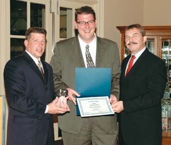 Azrock division recognized three of its sales managers for outstanding performances with the resilient mill’s premium products. Awards were presented to Chris Grimes, Upper Midwest; Bob Foy, Western, and Ted Higginbotham, Texas, during the company’s annual sales meeting in San Antonio. Pictured receiving the award is Grimes from