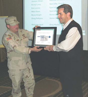 Pergo employees showed pride for both their company and their country at the company’s 2006 national sales meeting. The leading manufacturer and marketer of laminate flooring received the Secretary of Defense Employer Support Patriot Award from Staff Sergeant Greg Martin—a member of the New York Army National Guard and territory sales manager for Pergo—in recognition and appreciation of the support he received from the mill before, during and after he was called to active duty in Iraq in 2003.