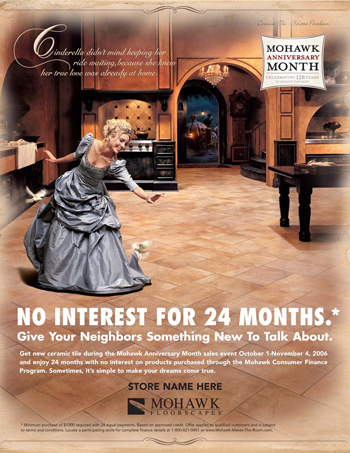From October 1 through November 4, Mohawk Floorscapes, Mohawk ColorCenter and Mohawk Floorz dealers will mark Mohawk’s 128th anniversary with a national sales event. Based on the fairy tale themed consumer ad campaign, this year’s sale is called “The Fairest of Them All,” and takes advantage of the impact made by Mohawk’s ongoing branding efforts.