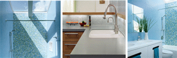 Hakatai’s versatile collection of glass tile products also helped Ogawa remodel the kitchen. The backsplash, originally slated to receive solid glass panels, proved too prohibitive to realize. Searching for something more flexible to configure, Hakatai’s mesh-backed Ashland Series in 1” x 1” mosaic glass tiles were the perfect solution. Stylish and handmade, the Ashland Series contains random crazing on the surface of the tile, rough-cut edges and beautiful shade variances of tiles within each sheet. Ogawa selected the color Snowdrift Blue for the backsplash.