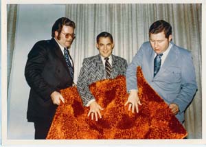 This photo was taken in January of 1971, during the winter market in Chicago—and 35 years ago, the Chicago market was the granddaddy of them all. Diamond Carpet Mills, then a year-old company, made its first trip to the Windy City market and this trio proudly showed a sample of one of the lines it was introducing. Shown here are Harold Woodard, left, vice president; Ed Kirkland, center, regional sales manager, and Ed Weaver, Diamond president.