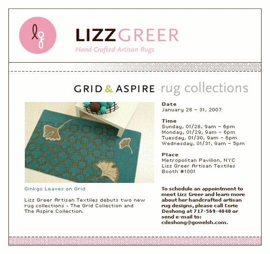 | | | Lizz Greer, designer of unique and exquisitely handcrafted artisan rugs, is pleased to announce that the company will debut two new collections at The New York Home Textiles Show, January 28-31. |