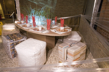 Elle Décor’s Dining by Design fundraiser is a national event, held annually to benefit the Design Industries Foundation Fighting AIDS (DIFFA). Karastan has participated in the event for the past three years, and for this, the 10th anniversary, the company’s theme was “Make a Statement”. To bring the concept to life, Karastan took common, everyday items, like soap, rubber bands, cotton balls and pencils, and transformed them into furnishings and walls. The entire space was ingeniously decorated by using typical items in atypical ways to “Make a Statement”. Karastan also had renowned performance artist/typist, Sheryl Oring, on hand to help guests “Make a Statement” for DIFFA, and later presented the typed notes to the organization as a memento.