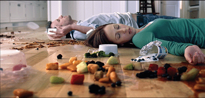 A couple is overcome when sniffing leftovers in a television ad for Armstrong wood flooring. |