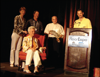 A lifetime of achievement. At the annual FloorExpo conference in Denver, Home Solutions member Bill Billingsley, owner of Miller Bros. Floors in Stafford, Tex., was honored with the prestigious Lifetime Achievement Award. Billingsley, center, received the award from FloorExpo CEO Dave Gheesling, at podium, as his wife Sandra (seated), daughter Kelli Metzenthin and son Buddy Billingsley looked on.