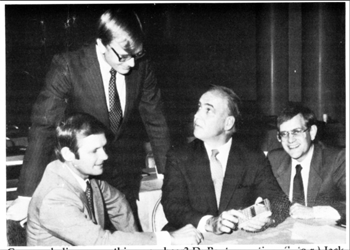 This photo was taken 25 years ago during DuPont’s launch of two major retail promotions. Four of the fiber company’s executives discussed the Panasonic “talking” calculator that was included in the promotions kit given to retailers. Shown, from left, are Jack Krol, director of the Carpet Fibers Division; John Himes, director of marketing, carpet fibers; Tom Chattin, marketing services manager, and Robert Axtell, end-use marketing manager. That was in 1982, where are they now?