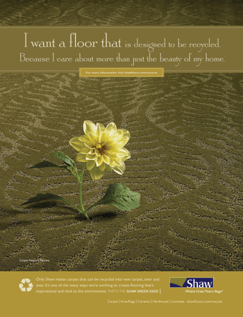 The idea of these ads is to call attention to the fact we have products which are environmentally friendly, he explained. “The message, as we have in all our advertising is, to direct the consumer to shawfloors.com where she can get as much information as possible about the products. There is also a link that goes to our Shaw Green Edge Web site where she can learn about all our Green Edge initiatives.