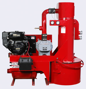 The Woody-Vac has a Kohler 12HP gas engine with electric start battery, and is also available as an electric unit for cart mounted portability. The standard accessory package includes a 300' capacity hose reel, and both 2" and 1.5" crush proof non-marking hoses along with swivel hose cuffs, steel hose connectors, Y adapters, and hose adapters for each size hose.