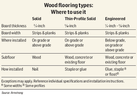 Engineered hardwood typically is installed with glue or staples, can also be “floated” with glue. Interlocking floating engineered floors do not require glue. Solid hardwood usually is installed with nails, although a 5/16-inch product installs with glue or staples.
