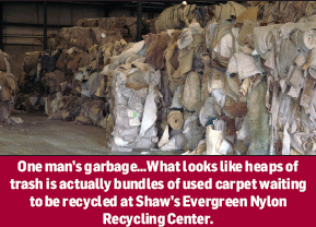 This is a great start, but there is much more to do. For example, Shaw’s collection network will recycle over 300 million pounds of carpet this year, enough to stretch a 12-foot band of carpet from New York to London to Paris and back again. Because this number represents only about 7% of the broadloom currently going to the landfill, other solutions are needed to keep used carpet from the dump.