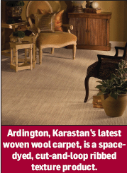 Karastan is launching two woven wool styles and three tufted carpets. Its woven introductions include Ardington and Tristan. Ardington is a space-dyed, cut-and-loop ribbed texture that creates excitement, noted a company spokeswoman. “Karastan heightens the drama of this fun, yet versatile, offering by weaving it in eight, two-color combinations of tonal and contrasting hues. Use of 100% New Zealand wool lends softness, durability and lasting beauty to a composition that defies convention.”