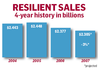 Kim Holm, Mannington’s president of residential business, described the first half of 2007 as challenging. He said the company’s residential business was off approximately 10% to 12% from 2006, but commercially up 2% to 5%. He, like others, blamed not only the housing crash but also rising costs of raw materials. “Our challenge this year is the market is not only going down, but at the same time costs are on the rise.”