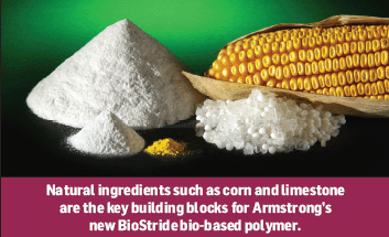 The fruition of a multi-year, multi-million dollar research and design project, BioStride provides the same or better performance attributes as vinyl polymers, he said, yet has 13% bio-based content by weight. “With BioStride, Armstrong has made a giant leap forward with the integration of rapidly renewable ingredients [such as corn], which reduces reliance on limited resources such as petroleum and fossil fuels.”