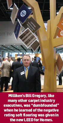 The LEED for Homes Rating System from the U.S. Green Building Council (USGBC), which, at press time, was in the process of being formally adopted by its more than 12,000 members after a two-year pilot program, for reasons unbeknown to manufacturers and associations, actually penalizes using carpeting in the home.
