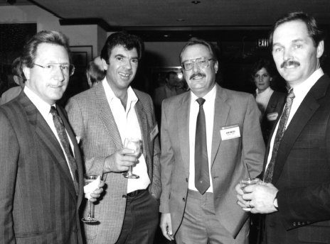 Trend-setting. Abbey Carpet held its third annual convention in the Atlanta Merchandise Mart in February 1987, when this photo was taken. Twenty years later Shaw Industries and Flooring Alliance are planning to hold meetings at AmericasMart Atlanta. Shown here are, from left, Peter Spirer, chairman of Horizon Industries; Abbey dealers Ken Neiman and John Mathis, and Ralph Boe. Horizon’s president. Abbey had 172 members then and today it has more than 750 as it approaches its 50th anniversary.