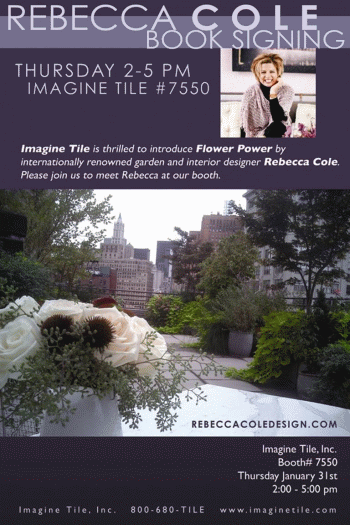New York City, NY January 22, 2008 - Rebecca Cole, garden, interior and floral designer, event and wedding planner, author, radio and television personality designed “FLOWER POWER”, a modern organic line of ceramic tiles for Imagine Tiles featuring photo realistic blooming buds and original graphic designs from the renowned trend setter. Rebecca rose to fame as morning TV’s gardening guru on NBC’s Today Show from 1996 through 2002.