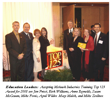 Mohawk was recognized at an awards banquet conducted by Training Magazine in February. Attending for Mohawk were Zoellner; Mike Ferris, Director of Training, Dal-tile; Anne Reynolds, Training and Communications Manager, Mohawk Home; Susan McGowan, Director of Corporate Training and Administration; Kirk Williams, National Sales Training Director, Mohawk; April Wilder, Manager Mohawk University Retail Group; and Mary Malek, Corporate Training Manager.