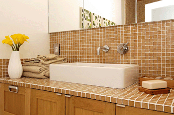 Dawson & Clinton purchased the multi-family building, then transformed it. The classic look of white surfaces and hardwoods was updated by the use of glass tile. The rough-edged elegance of Hakatai’s Ashland series tile provides a historic feel to the rooms, and the color chosen, Ginger Tea, complements the other materials used. The bathroom in each one-bedroom unit received 80 square feet of tile. The tile was used in the tub surrounds, all three walls of each shower, the countertops, as well as the half-wall backsplashes behind the raised vestibule sinks.