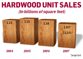 Stay aggressive. Diversify products. Go green. These were the focal points of top hardwood mills as the category comes off yet another down year. Offset by continued slowdown in the housing sector, significant hits to new home construction, credit issues, lack of consumer confidence and an overall economic slump, executives reported an 11% to 14% drop in units last year from 2006—barely holding its billion-unit mark at 1.02 square feet. And, executives are not estimating a turnaround anytime soon, predicting this year will mirror last and stating 2009 is still a question mark.
