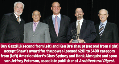 Shaw Living, accepted by Guy Gazzilli and Ken Breithaupt, for its “scale of pattern, nice balance of color and interesting geometry square and arabesque mix.”