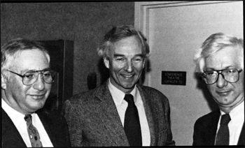 Carpet & Rug Institute’s two-day Presidents’ Council, a biennial event in the nation’s capital, afforded leaders in our industry an opportunity to discuss business, the economy and pressing issues with members of the Senate, Congress and heads of government agencies. Shown here during a break in the sessions on April 6, 1987, are Burton Gold, left, of Stratton Industries, a division of WestPoint Pepperell, and Joe Maffett, right, president and CEO of Coronet Industries. The Georgia boys flanked Sen. Wyche Fowler, Jr. (D-Ga.) and shared some views on the carpet industry.