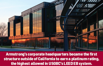 Proof of the company’s continued commitment came last year when Armstrong’s headquarters received the highest level of certification from the U.S. Green Building Council (USGBC) under its LEED Green Building Rating System for existing buildings. The building was only the sixth existing structure—and the first outside of California—to achieve Platinum Certification.