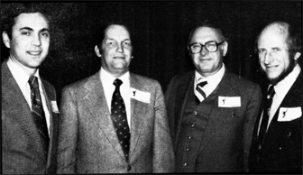 Shown here during the festivities are, from left, Tony diBianco of Hoechst; Bill Orders of Orders Distributing; Ted Schuler of Schuler Distributing Co., and Paul Pumphreys of Cleaver Carpet. It was a great night and a great market.