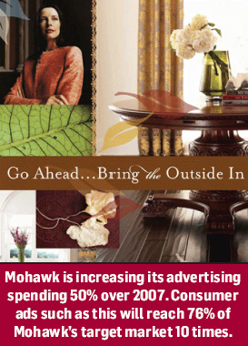The Mohawk strategy entails creating pull when other manufacturers are hunkering back and not doing a whole lot, Carson said. Duncan added, “We will reach 76% of our target market 10 times. Anything over four times is considered stellar.” He noted that Mohawk has increased its advertising spending 50% from 2007 and its hardwood flooring spending is three times what it was last year.