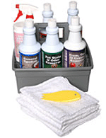 The kit contains one quart of each of the five spotters we offer – General Spotter, Coffee & Tea Stain Remover, Gum, Tar & Grease Remover, Juice & Dye Stain Remover and Pet Stain & Odor Remover, plus a bottle of Stain Blotter Powder, six cotton spotting towels, a carpet shark and a trigger sprayer in a handy carry caddy.