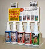 The four-color counter display fits five bottles of stain remover and features two pockets for 8 X 11 inch tri-fold brochures— one for the Spotting Solutions brochures and one for professional cleaners information. The display retails for $59.95, but is free with the purchase of 10 cases, and shipping is free with all orders.