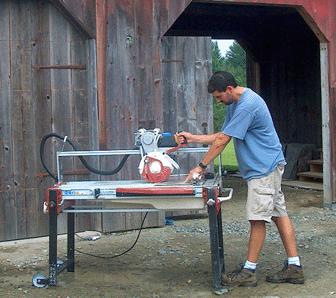 King, a high-end custom and resort home contractor in Vermont’s scenic Sugarbush Valley, immediately put the new Raimondi Tools, USA, Gladiator Advanced Overhead Rail Saw with Raimondi’s exclusive T3 Razor blade to use on a 1,000 square foot custom floor using reclaimed slate from an old farm roof in Southern Vermont. The large-format, 22” x 12” slate roof tiles proved no match for the Raimondi Gladiator Advanced Overhead Rail Saw and the laser-like precision of the T3 Razor, Raimondi’s thinnest and quietest blade.