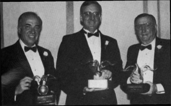 Floor Covering Industry Foundation (FCIF) dinner honoring a manufacturer, distributor and retailer. Shown here with the awards presented to them at the FCIF’s 9th annual banquet are, Don Kuhn, left, president of Coronet Industries; Peter Chick, center, president of Sound Floor