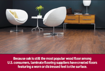 Consumers just need to take one step into a dealer’s laminate section to see products that look exactly like far-off exotic species from a remote jungle in Africa or from the less traveled regions in Eastern Europe, South America and Australia. And, because oak is still the popular wood floor among U.S. consumers, laminate mills have created floors featuring a worn or distressed feel to the surface. Consumers are immediately transported back to a simpler time in American history as the rustic look continues to be among the most popular types of floors being asked for by designers and everyday customers.