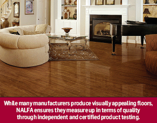 Myth No. 2: All laminate flooring is the same. The good news is there are manufacturers and importers who exert the time and money to produce high-quality and superbly visually appealing flooring products. The purpose of NALFA’s creation in 1997 was to “create voluntary product standards for laminate flooring in North America.” An assurance of quality and the resultant NALFA certification requires independent and certified product testing. A company need not be a member of NALFA to test for certification. However, to receive it the floor must be tested to these published standards. Our NALFA certification ensures product quality much the same as any other reputable trade association’s product testing.