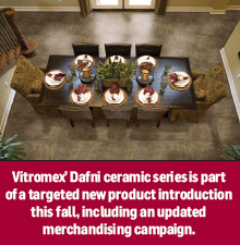 With these in mind, Vitromex will be launching a very targeted product introduction this fall, followed by a much more aggressive one beginning in 2009, Ballucchi explained. Some new products are: Lucca, a modern interpretation of terracotta tile; Trentino, a modern marble floor; Dafni ceramic series, and several additions to already popular lines like Angra and Cotto Antico.