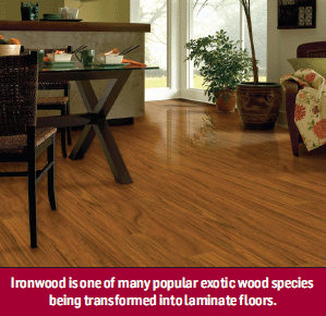 Other popular exotic wood species being transformed into laminate floors include ironwood, tigerwood, African walnut, Rosewood, merbau, Eucalyptus and Kempas to name a few.