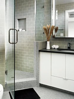 Hiromi Ogawa Architects principal designer Lynn Fisher specified 200 square feet of Hakatai’s Classic series ¾” x ¾” glass mosaic tile in the soothing color of Pale Grey, creating beautiful bathroom settings in harmony with the modern touches added to the rest of the house. Hiromi Ogawa Architects, with offices in San Francisco and Portland, Oregon, recognizes that there is no longer a lot of buildable land available in California, and often the best way to meet their customers’ needs is to update their existing homes. Hakatai glass mosaic tile has played a major role in several of their projects. The versatile look of glass tile allows for its use with modern amenities, while still honoring the traditional Craftsman style.