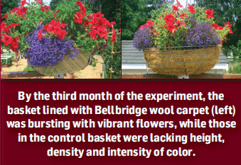 Over a three-month period, students measured and photographed the flowers at regular intervals. After the second month, it was obvious the wool-lined baskets were out-growing the traditional-lined one in height, density and intensity of color. When the flowers peaked, it was concluded the wool lining promoted healthier, more vibrant flowers compared to the control basket which appeared to lack vigor.