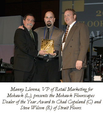 The Mohawk Floorscapes Dealer of the Year Award recognizes exceptional work within a group comprised of the best retailing minds in the nation. The award is based on a number of criteria, including a percentage increase over previous year’s business, excellence in promoting the store concept, ongoing commitment to training, store standards, brand building, merchandising and installation ideas and community involvement. Nine stores in North America were nominated as regional Dealer of the Year winners, with Strait Floors selected for the top honor.