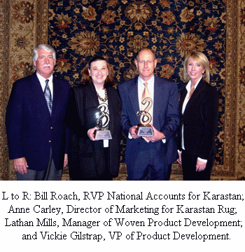 Karastan is a 12-time winner of America’s Magnificent Carpet Awards, an annual contest held during the Atlanta Rug Market in January. This year, Karastan was a double winner, taking home Best Overall in the power-loomed $1,000+ (retail) category with Eastport from the Original Karastan Collection and Best Overall in the power-loomed $400-$1,000 (retail) category with French Quarter in Bluestone from the Sierra Mar Collection. The awards were presented to Karastan at a ceremony held at the Marriott Marquis Hotel in Atlanta, GA.