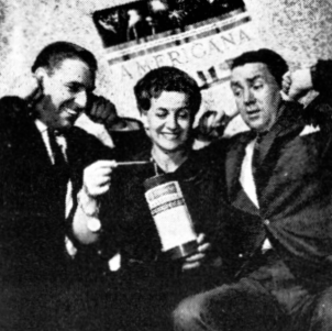 Congoleum-Nairn showroom. Lee Kolker, director of design, is about to set off the first stage in a major promotion for Americana, a new Flor-Ever vinyl, “styled and priced for the mass tract housing market.” Participating in the promotion are Bill Martin, left, vice president of advertising, and John Murphy, general sales manager, waiting for the blast off. The firecracker is actually a sample mailing tube in which dealers from around the country are getting their Americana samples.