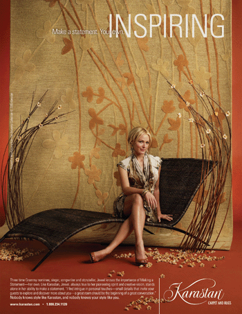 As the sixth statement-maker to appear in the series, Jewel succeeds such luminaries as actress Kelly Preston, “Law and Order: SVU” star Mariska Hargitay, “Lost” star Evangeline Lilly, and actress/model Andie MacDowell. Jewel’s ambition to “make a statement” in both her professional and personal life are perfectly aligned with the passion that has helped Karastan to become the leading American manufacturer of exquisite, premium-quality carpets and rugs.