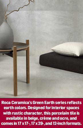 The Green Earth series reflects earth colors, including ochre-brownish tones. “This porcelain tile is an ideal solution for interior spaces with rustic character,” said a company spokesperson. Available in beige, crème and ocre. Formats include 17 x 17, 17 x 29, and 12 x 12.