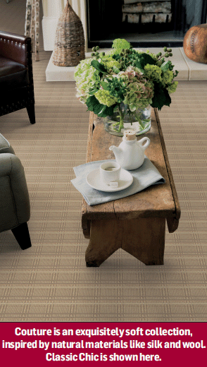 Couture is soft, inspired by natural materials like silk and wool. “The collection was created to coordinate with and complement many other Shaw products in wood, stone, tile and laminate. The selected styles were all designed to go together like a wardrobe.”