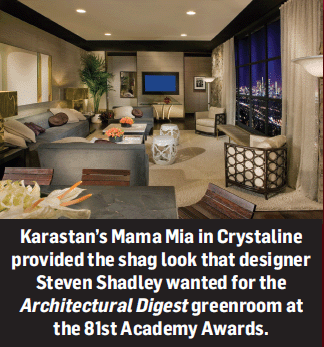 Karastan’s Mama Mia shag rug in Chystaline. Inspired by the hit Broadway play and subsequent movie of the same name, the rug proved to be “a key element,” noted Connie Berry, director of marketing for Karastan. “Our new Mama Mia shag provided the perfect Seventies Modern look. We simply bound the carpet to fit the space and let the beauty of the style speak for itself.”