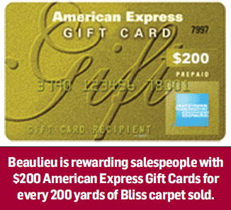 Beaulieu of AmericaA new sales incentive has dealers earning a $200 American Express Gift Card for every 200 square yards of any Bliss carpet style (except Bliss for Kids) they sell between April 1 and May 31. Sales verification must be postmarked by June 30.